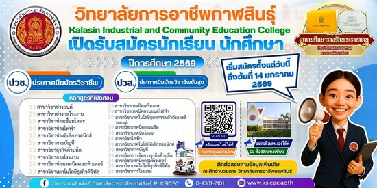 วิทยาลัยการอาชีพกาฬสินธุ์เปิดตั้งแต่วันนี้ (บัดนี้เป็นต้นไป) สามารถเข้ามาสมัครในเวลาราชการ วันจันทร์ - วันศุกร์ ณ งานทะเบียน วิทยาลัยการอาชีพกาฬสินธุ์ ติดต่อสอบถาม : : 0-4381-2101
