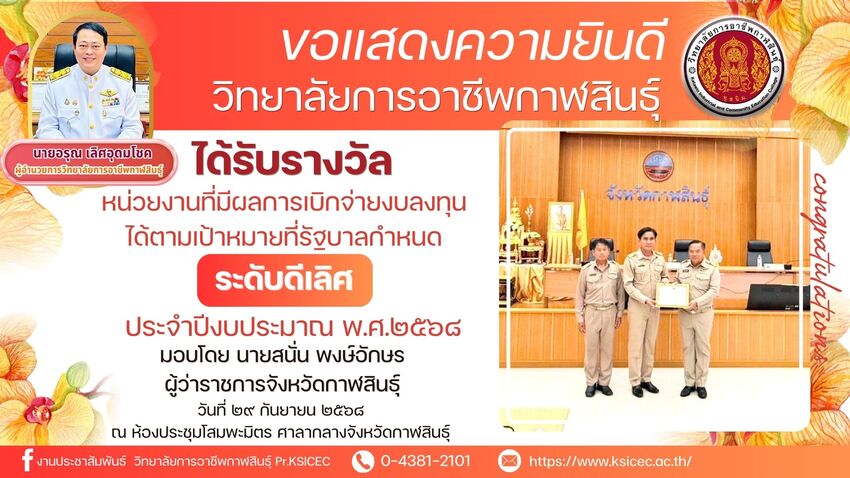 ขอแสดงความยินดีกับ วิทยาลัยการอาชีพกาฬสินธุ์ ได้รับรางวัล หน่วยงานที่มีผลการเบิกจ่ายงบลงทุนได้ตามเป้าหมายที่รัฐบาลกำหนด ประจำปีงบประมาณ พ.ศ.๒๕๖๘ มอบโดย นายสนั่น พงษ์อักษร ผู้ว่าราชการจังหวัดกาฬสินธุ์ วันที่ ๒๙ กันยายน พ.ศ.๒๕๖๘ ณ ห้องประชุมโสมพะมิตร ศาลากลางจังหวัดกาฬสินธุ์