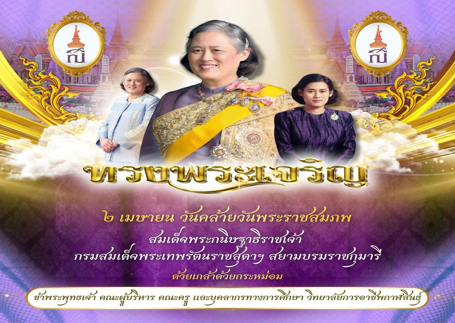 ทรงพระเจริญ ๒ เมษายน ๒๕๖๙ เนื่องในโอกาสวันคล้ายวันพระราชสมภพ สมเด็จพระกนิษฐาธิราชเจ้า กรมสมเด็จพระเทพรัตนราชสุดาฯ สยามบรมราชกุมารี ด้วยเกล้าด้วยกระหม่อม ข้าพระพุทธเจ้า คณะผู้บริหาร คณะครู และบุคลากรทางการศึกษา วิทยาลัยการอาชีพกาฬสินธุ์