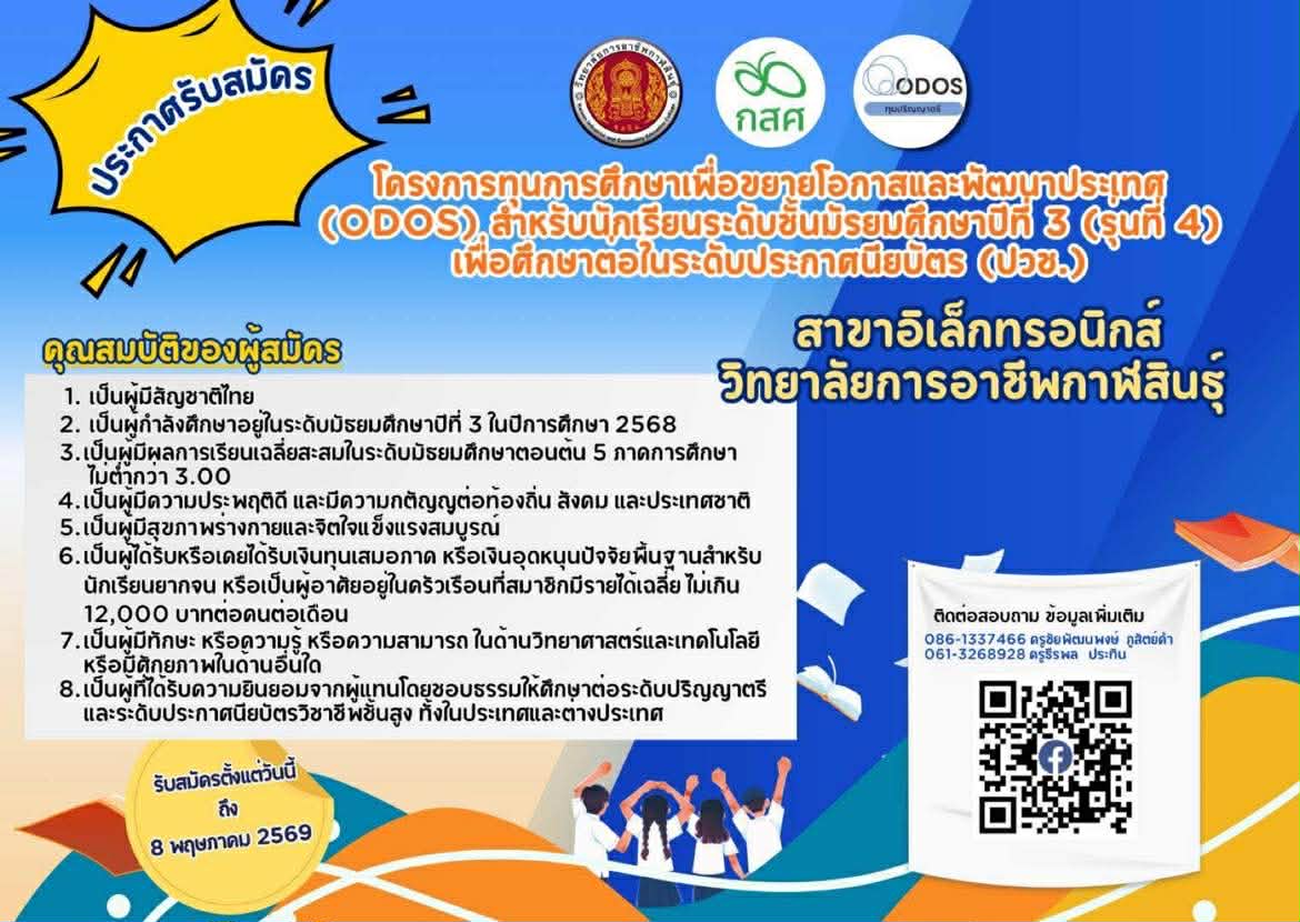 ประกาศรับสมัคร: ทุนการศึกษาโครงการ ODOS (รุ่นที่ 4) โอกาสดีๆ สำหรับน้องๆ ม.3 ที่อยากเรียนต่อสายอาชีพ! วิทยาลัยการอาชีพกาฬสินธุ์ เปิดรับสมัครนักเรียนเข้าโครงการ "ทุนการศึกษาเพื่อขยายโอกาสและพัฒนาประเทศ (ODOS)" ในสาขา อิเล็กทรอนิกส์ เพื่อเข้าเรียนต่อในระดับ ปวช.