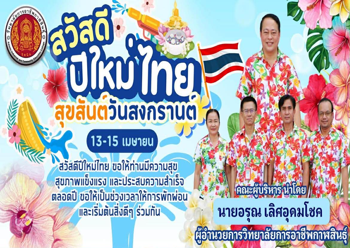 สุขสันต์วันสงกรานต์และสวัสดีปีใหม่ไทย ๒๕๖๙ วิทยาลัยการอาชีพกาฬสินธุ์ นำโดย นายอรุณ เลิศอุดมโชค ผู้อำนวยการวิทยาลัยการอาชีพกาฬสินธุ์ พร้อมด้วยคณะผู้บริหาร ครู และบุคลากรทางการศึกษา ขอส่งความปรารถนาดีไปยังนักเรียน นักศึกษา และพี่น้องชาวกาฬสินธุ์ทุกท่าน