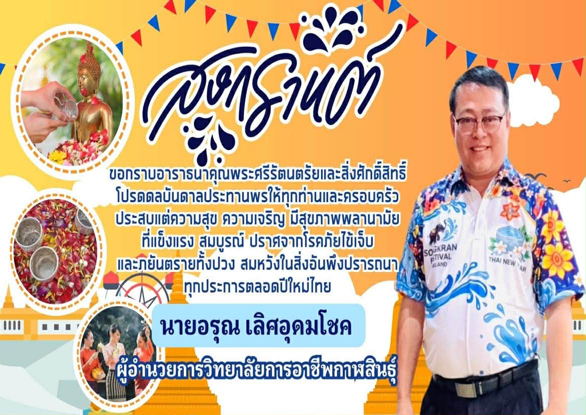 สวัสดีปีใหม่ไทย ๒๕๖๙ สุขสันต์วันสงกรานต์ วิทยาลัยการอาชีพกาฬสินธุ์ นำโดย นายอรุณ เลิศอุดมโชค ผู้อำนวยการวิทยาลัยการอาชีพกาฬสินธุ์ ขอส่งความปรารถนาดีและคำอำนวยพรเนื่องในโอกาสเทศกาลสงกรานต์และวันขึ้นปีใหม่ไทย